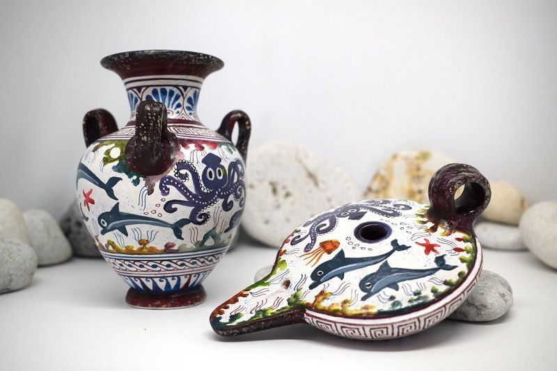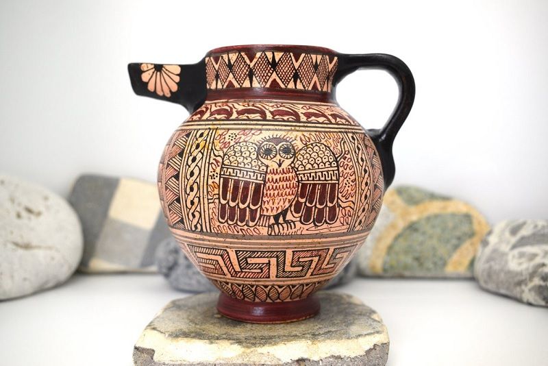 Jak już wspomniałam początki były trudne, byłam samoukiem podpatrującym prace innych. Dzięki temu wypracowałam swój własny styl, zaczęłam robić coś, czego nie robili inni. Takim znakiem rozpoznawczym jest „koryntiako”, czyli wydrapywane zwierzęta i kwiatki. Jest to robione na wzór dawnego korynckiego sposobu malowania, ale to coś innego, naszego. Podobnie z wzorami kreteńskimi, które też bazują na klasyce, ale maluję w tym stylu np. delfiny, dno morza i to już całkiem mój charakter. Innym takim charakterystycznym elementem jest sowa. Poza tym bardzo lubię robić kopie muzealne, przy których należy pilnować wiernego oddania wzoru.