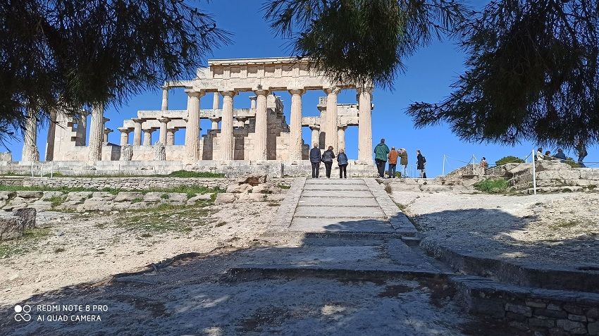 Na wzgórzu lasu piniowego ukazał nam się najpiękniejszy zabytek wyspy. Otulają ją lasy sosnowe. Stoi tak cała w bieli na tle błękitnego nieba. Widok, który zaparł mi dech w piersiach. Do pełni szczęścia wystarczy stanąć u boku świątyni i podziwiać roztaczający się malowniczy widok na wyspę Eginę i zatokę sarońską. Spędziliśmy tam dużo czasu spacerując wśród ruin. Boczne kolumny są szersze od pozostałych, aby na tle nieba nie wydawały się zbyt cienkie. Świątynia robi naprawdę ogromne wrażenie.
