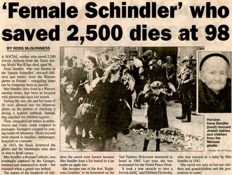Στις 15 Φεβρουαρίου 1910 γεννήθηκε Ιρένα Σέντλερ μια γυναίκα ηρωιδά η οποία την διάρκεια Β Παγκοσμίου Πολέμου, έσωσε με το έργο της 2.500 παιδιά εβραϊκών οικογενειών.