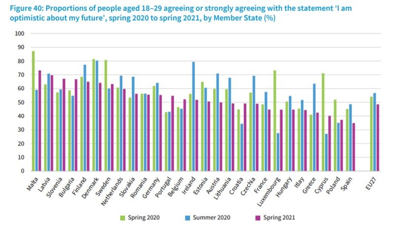 Ο μέσος όρος «αισιοδοξίας» σε ολόκληρη την ΕΕ κατά τον τελευταίο γύρο της έρευνας, την άνοιξη του 2021, ήταν λίγο κάτω από το 50%. Τα υψηλότερα ποσοστά, περίπου 70%, καταγράφηκαν στη Μάλτα, τη Λετονία και τη Σλοβενία.