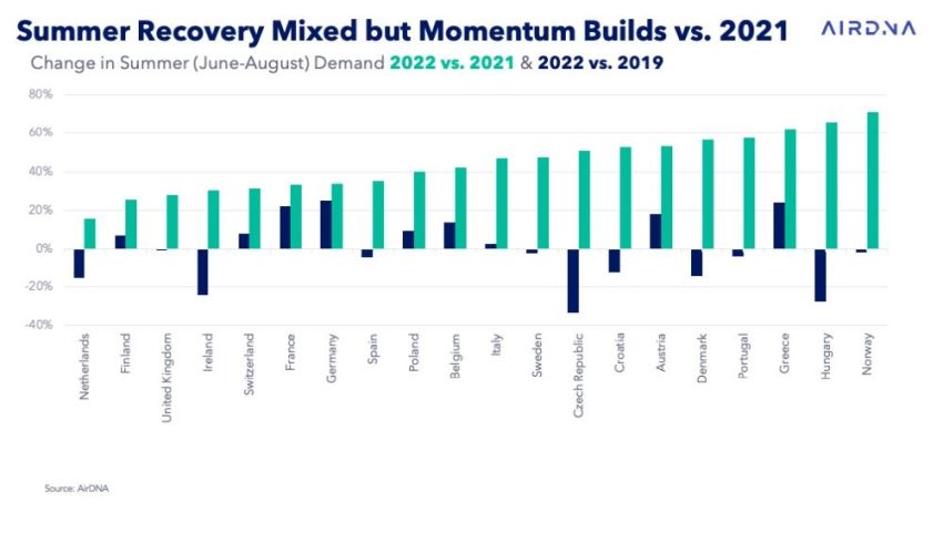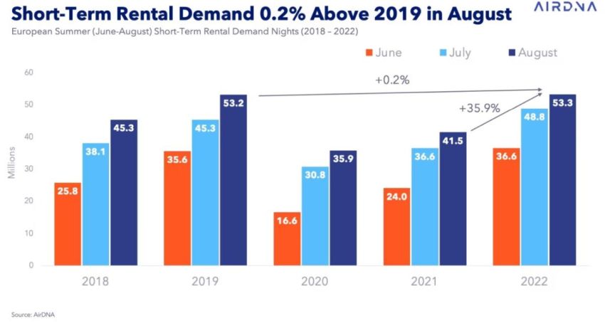 Ogólnie rzecz biorąc, w Europie w sierpniu popyt na noclegi typu Airbnb wzrósł o 35,9 proc. w stosunku do roku 2021 i o 0,2 proc. w stosunku do roku 2019.