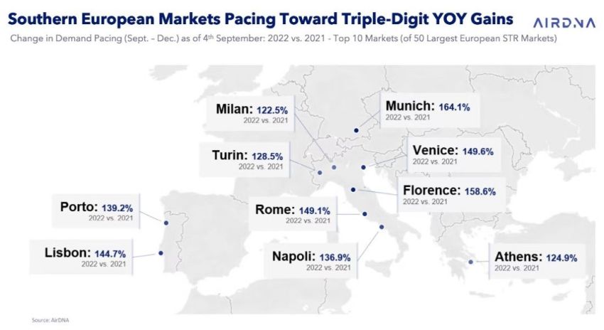 Według raportu AirDNA, we wszystkich 20 krajach europejskich odnotowano w tym roku większy popyt niż latem ubiegłego roku. Sześć z dziesięciu najlepszych miejsc na city-break, które do końca roku odnotują jeszcze większy popyt, znajduje się we Włoszech, Portugalii, Grecji i Niemczech.