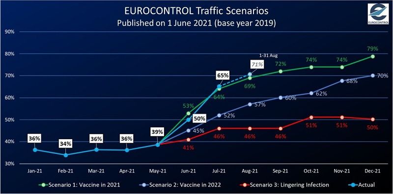 Eurocontrol podkreślił również, że ruch lotniczy w sierpniu osiągnął 71 procent poziomów z 2019 r., nieco powyżej najbardziej optymistycznego scenariusza ogłoszonego w czerwcu, który odnosił się do sieci obsługującej 69 procent poziomów ruchu z 2019 r. w sierpniu.