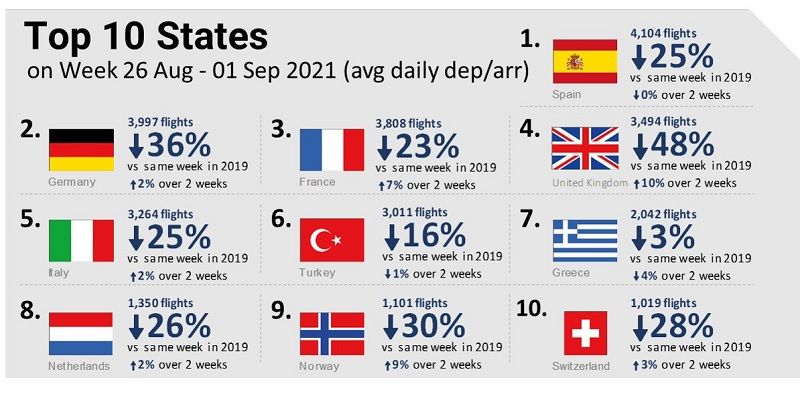 Ogólnie w rankingu krajów europejskich z największą liczbą lotów w tygodniu od 26 sierpnia do 1 września Grecja znajduje się na 7. miejscu, podczas gdy Hiszpania prowadzi z liczbą 4104 lotów, co oznacza spadek o 25 procent w porównaniu z analogicznym okresem w 2019 r.