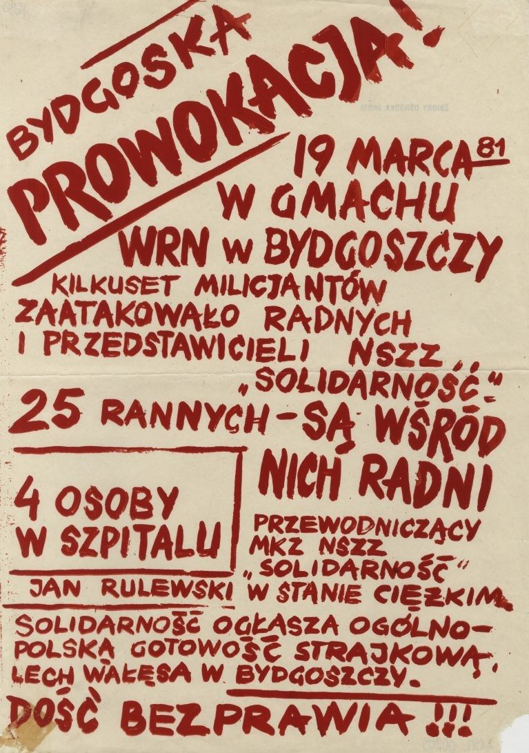 Prezydium KKP „Solidarność” z powodu ataku na Związek, jego władze i obrazę godności Związku odwołuje wszelkie rozmowy z władzami i ogłasza dla wszystkich instancji związkowych, wszystkich członków „Solidarności” stan gotowości strajkowej. […] Akcja, jaka miała miejsce 19 marca 1981 w Bydgoszczy, jest oczywistą prowokacją, wymierzoną w rząd premiera Jaruzelskiego.