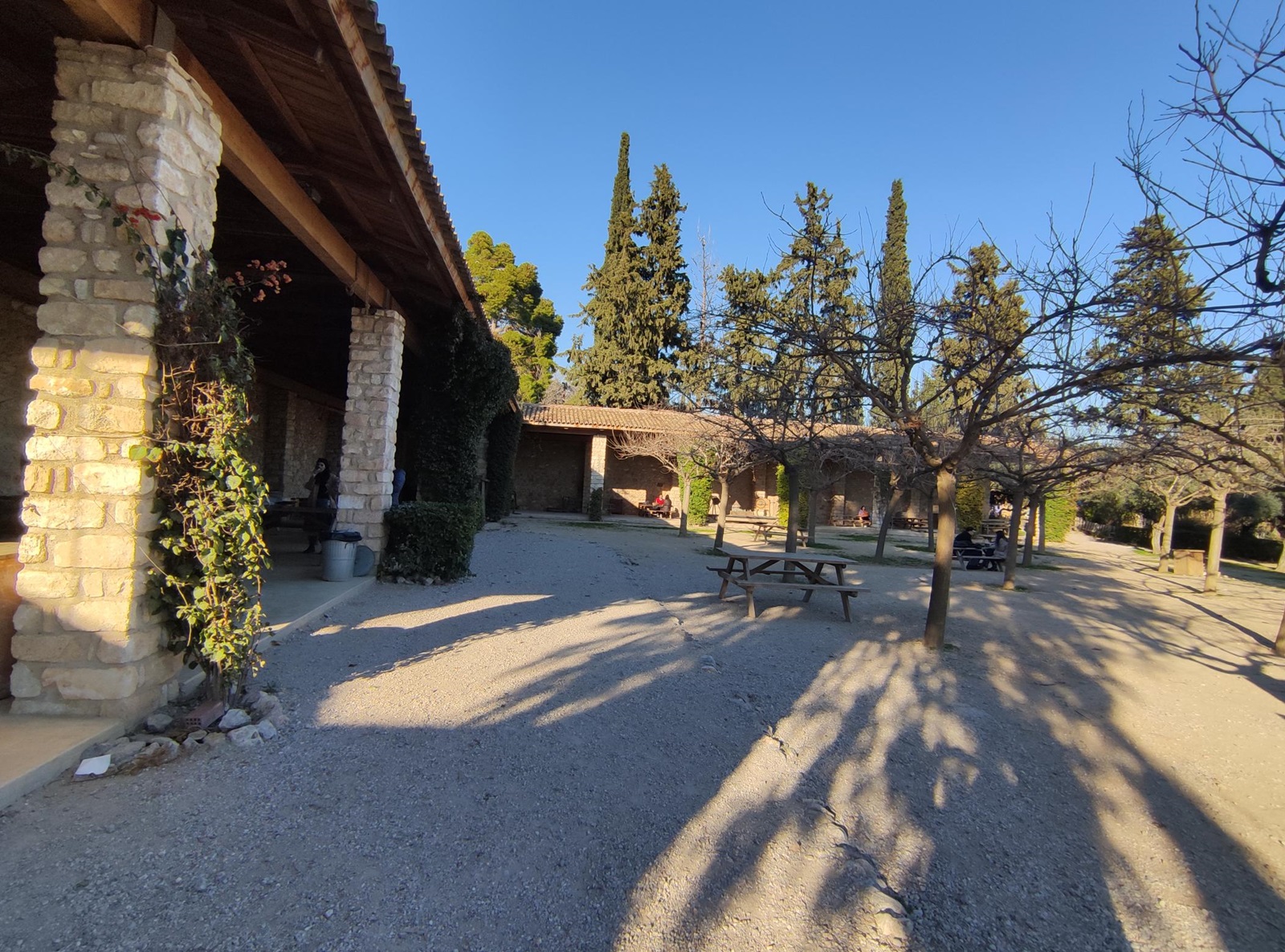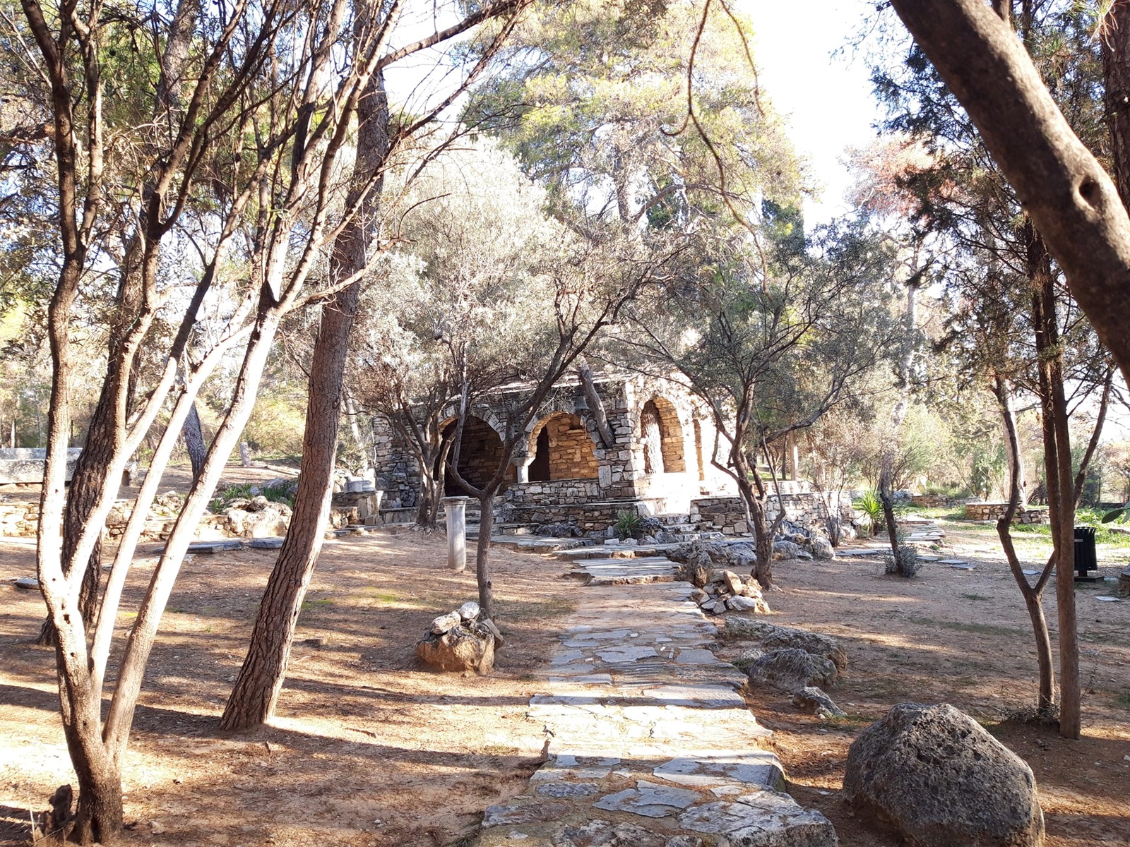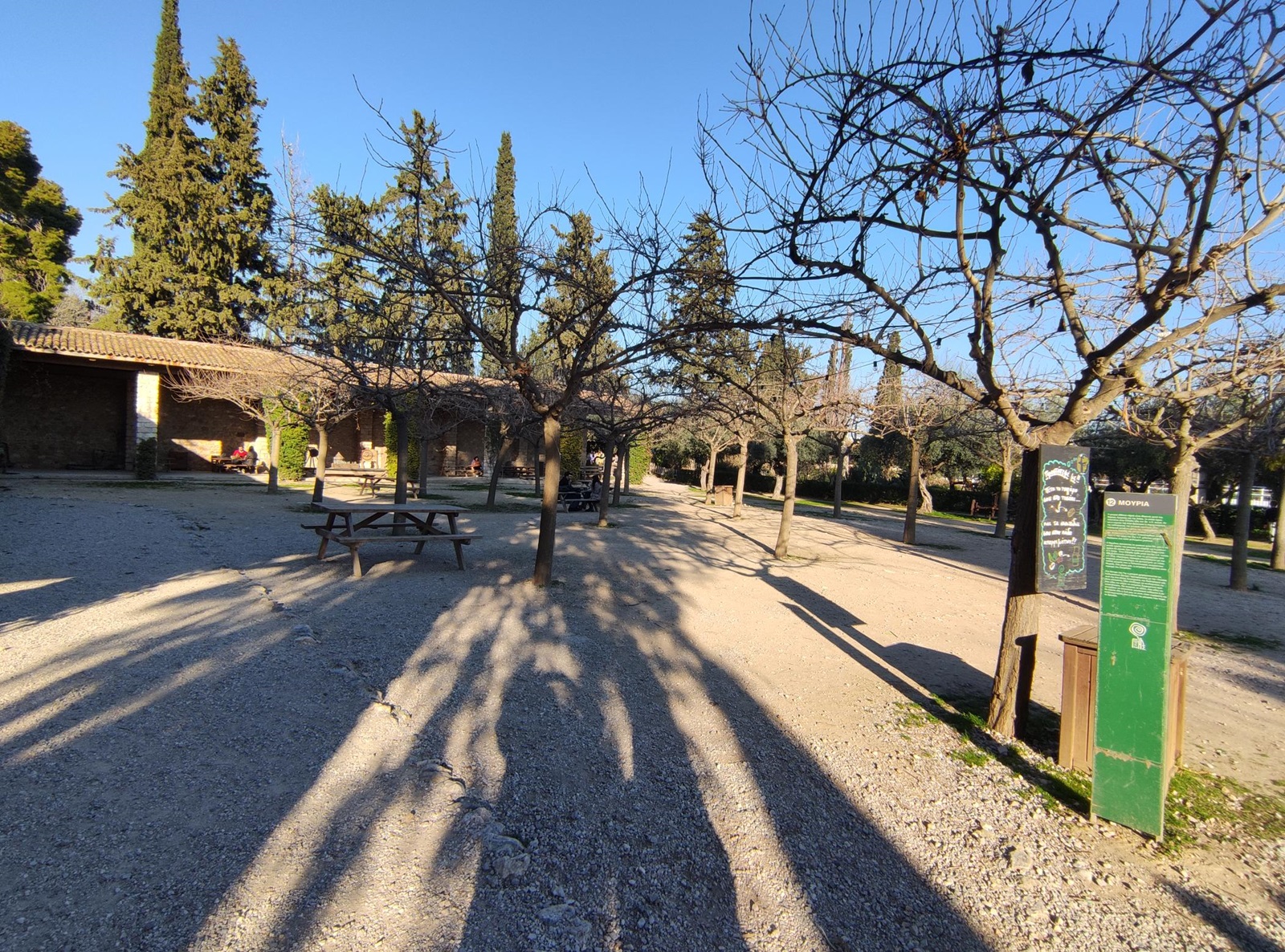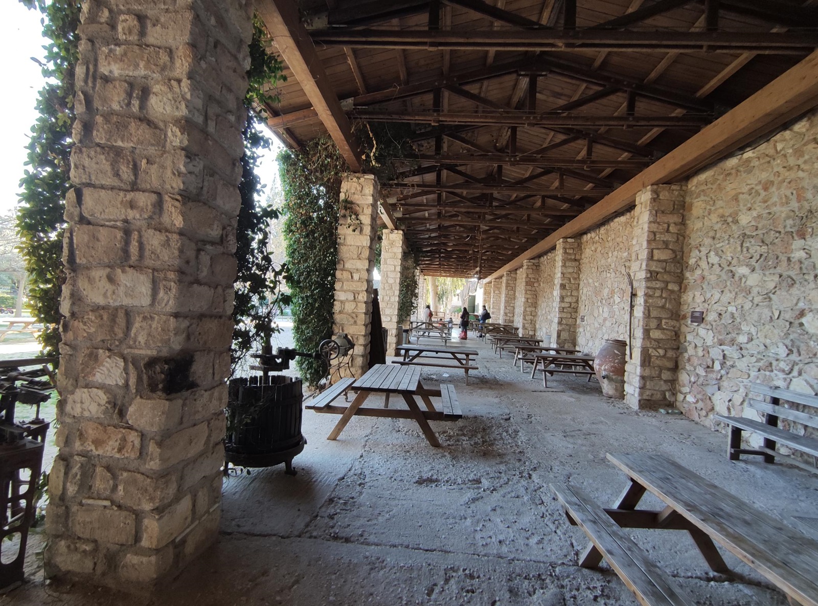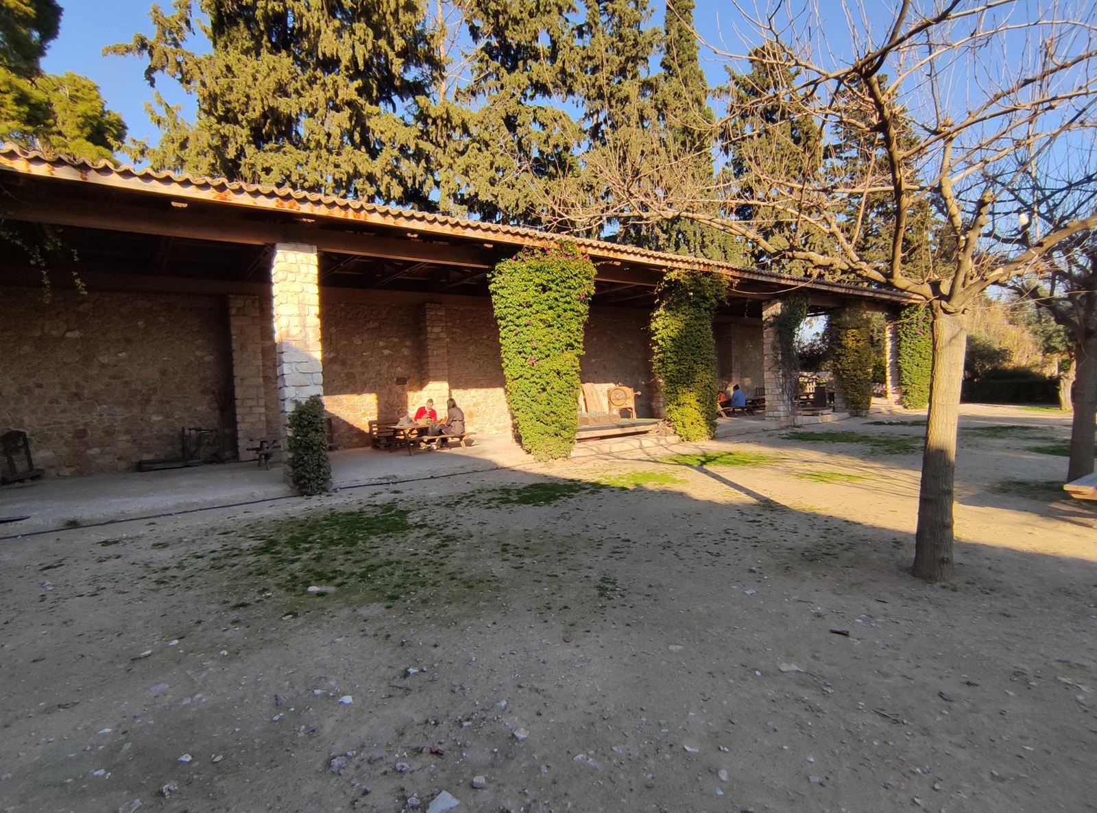 Na obszarze parku znajdziemy jeszcze kilka szczególnych miejsc. Pierwszym z nim jest Κέντρο της γης (Κentri tis gis) czyli tłumacząc dosł. Centrum Ziemi. Kiedy zobaczyłam nad zielonymi drzwiami ten napis nie byłam do końca pewna czy mogę przekroczyć progi Centrum. Jednak po chwili zauważyłam, że pojedyncze osoby bez żadnego skrępowania przez te drzwi wchodziły. Podążyłam więc za nimi. Prosta dróżka na samym wejściu zaprowadziła mnie do bardzo przyjaznego miejsca, gdzie przebywali głównie rodzice z dziećmi czy pary. Kręcąc się tam spostrzegłam coś, co przyciągnęło moją uwagę i nazwałabym to mini muzeum rolniczym na wolnym powietrzu. Pod sporym zadaszeniem poustawiane były różne urządzenia i przedmioty rolnicze z dawnych czasów. Nie wiele, ale i tak cieszyło oko.