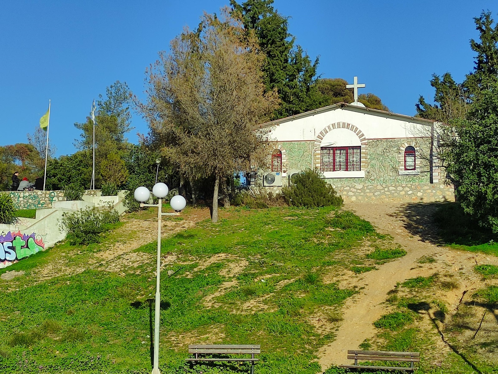 Pierwszy z nich to kościół Świętego Pawła, na który natkniemy się w głębi lasu około 10 minut na pieszo za największym jeziorem. Będąc już przy jeziorze skręcamy w lewo a potem w prawo i idziemy już cały czas prosto. Jeśli zauważymy siatkę to oznacza, że jesteśmy na miejscu. Ten unikalny kościółek został zaprojektowany i zbudowany w latach 1958-1960. Pomysłodawcami i zleceniodawcami jego powstania byli architekci z „Królewskiej Fundacji Narodowej”. Fundacja ta była centralnym organem promującą ideologiczną, edukacyjną i społeczną politykę Pałaców Królewskich w powojennej Grecji.
