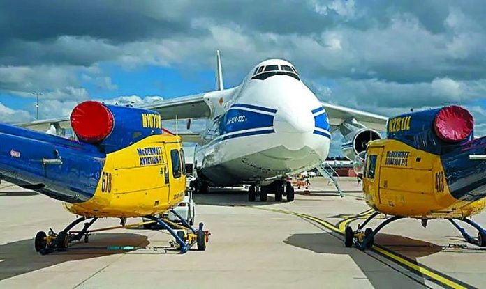 Śmigłowce i ich personel pomocniczy, składający się z około 20 pilotów, mechaników i tłumaczy, zostały załadowane do gigantycznego samolotu Antonov An-124 (na zdjęciu) w Australii i będą wspierać Grecję w walce z pożarami.