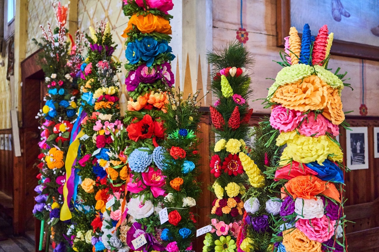 Lipnica Murowana w Małopolsce słynie z palm, które osiągają imponujące rozmiary – nawet ponad 30 metrów. To jedne z najwyższych palm wielkanocnych na świecie. Ich konstrukcja jest wyjątkowa: rdzeń stanowią giętkie pędy wierzby, dekoracje są skromne, najczęściej z bibuły i bukszpanu, całość jest lekka, ale bardzo wysoka, co wymaga dużej zręczności przy stawianiu. Co roku w Lipnicy odbywa się konkurs na najwyższą palmę, który przyciąga turystów i media z całej Polski. To wydarzenie stało się wizytówką regionu, a samo tworzenie palm jest tam traktowane jako sztuka. Do konkursu przyjmowane są wyłącznie palmy wykonane w duchu tradycji. Powinny powstać z naturalnych materiałów, takich jak pędy wierzby (wiklina), suszone kwiaty, rośliny zimozielone (na przykład bukszpan czy jałowiec) oraz bibułowe kwiaty i wstążki. Do wiązania palmy należy używać jedynie pędów wierzby.