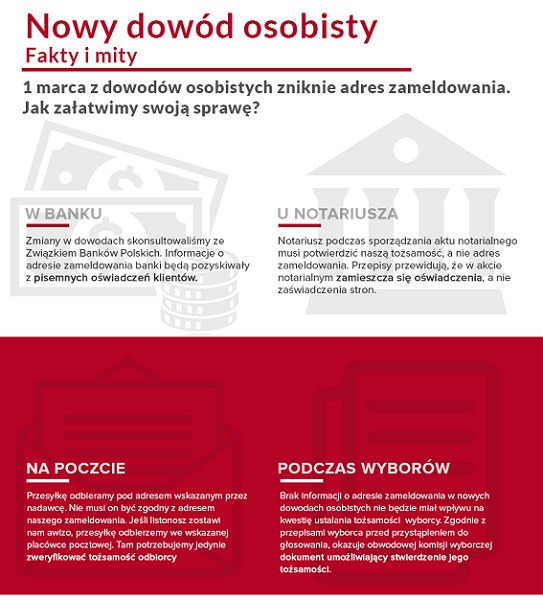 Od 1 marca w nowym dowodzie osobistym nie będzie już informacji o adresie zameldowania. Dzięki integracji rejestrów państwowych, urzędy same w razie potrzeby zweryfikują nasze dane adresowe w rejestrze PESEL. W banku czy u notariusza wystarczy oświadczenie obywatela potwierdzone własnoręcznym podpisem.