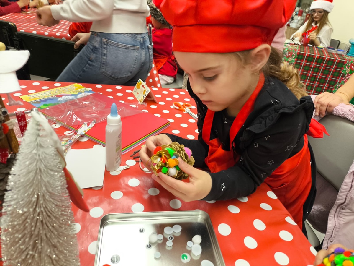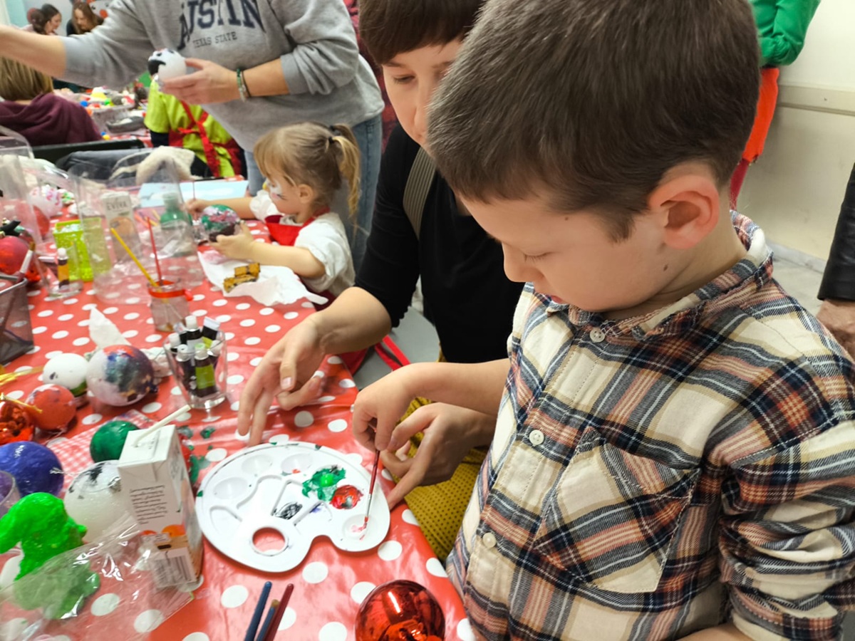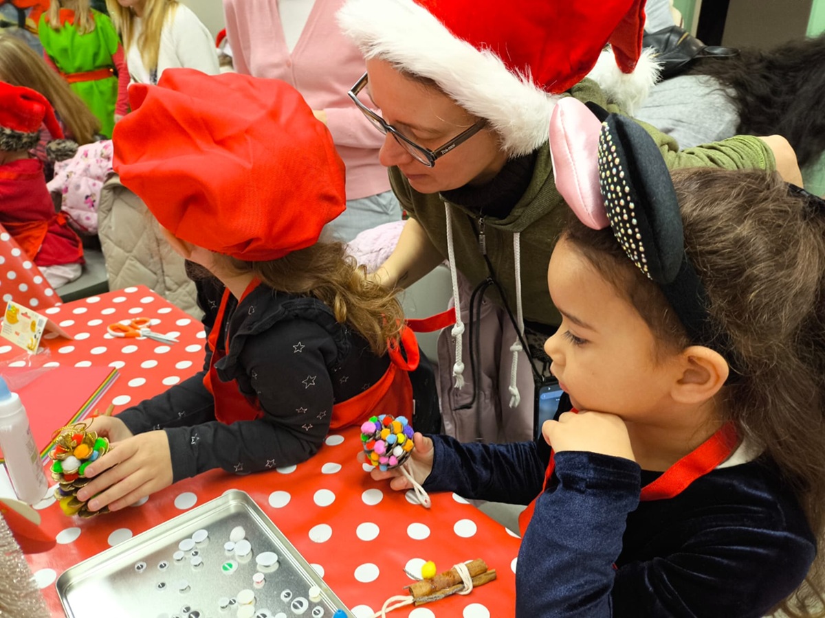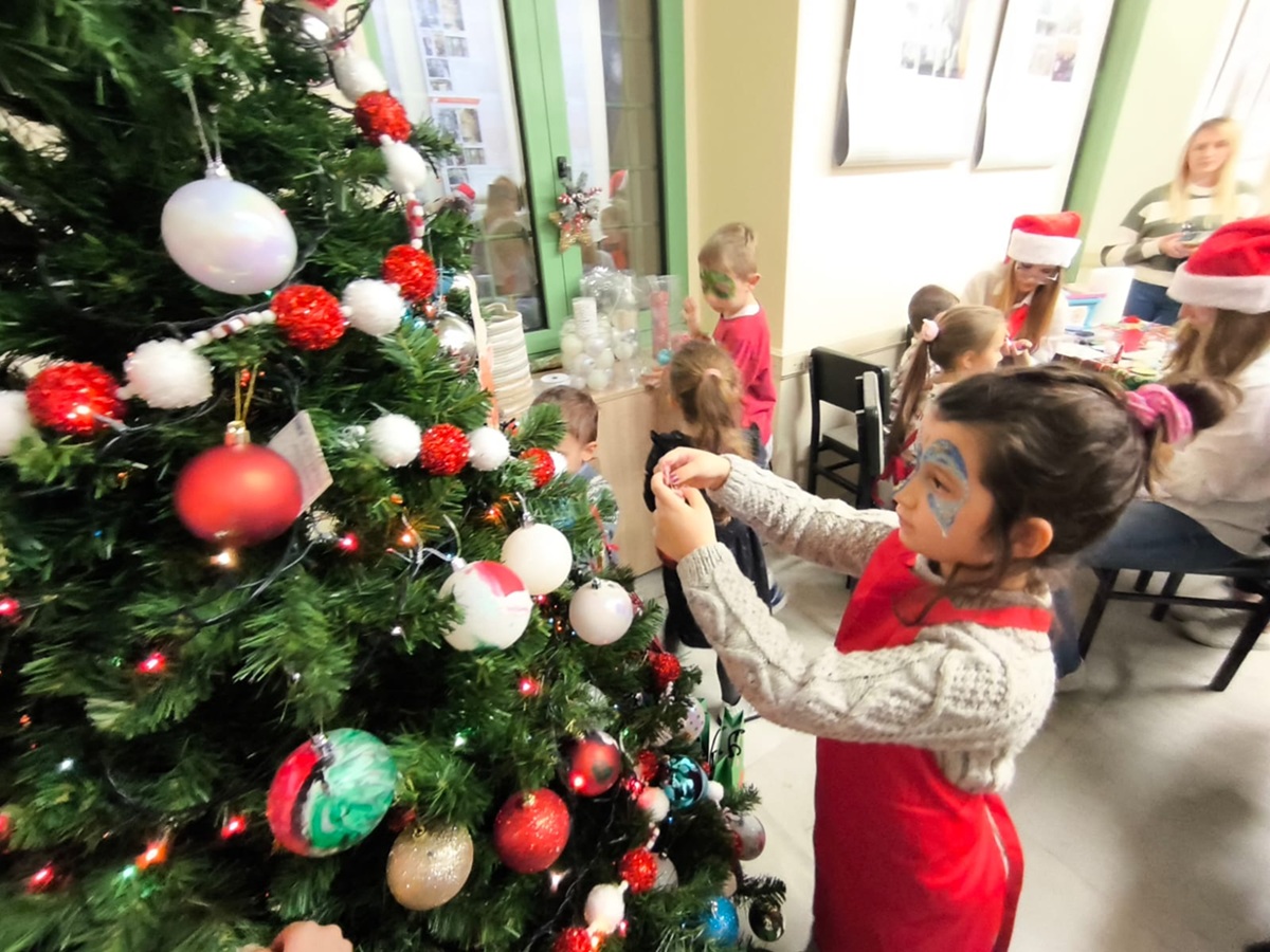 Równolegle odbywały się warsztaty tworzenia ozdób choinkowych oraz warsztaty plastyczne, które rozwijały wyobraźnię i zdolności manualne. Mali artyści malowali, wycinali, kleili i dekorowali na dziesiątki sposobów – od tradycyjnych bombek po autorskie prace inspirowane świątecznymi marzeniami. Każda ozdoba była wyjątkowa, a dumne spojrzenia dzieci prezentujących swoje dzieła rodzicom najlepiej świadczyły o radości tworzenia.