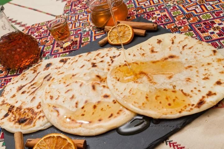 W misce łączymy przesianą mąkę, oliwę, raki, sól i wodę. Wyrabiamy aż do uzyskania jędrnego ciasta. Przykrywamy czystą ściereczką i zostawiamy do „odpoczęcia” na godzinę. Dzielimy ciasto na 6 części i wkładamy w środek łyżkę sera. Formujemy kulkę i odstawiamy na około 15 minut. Po tym czasie, ciasto wałkujemy na cienki placek o średnicy około 20 cm. Smażymy na nieprzywierającej patelni z małą ilością oliwy około minuty z każdej strony. Podajemy gorący, polany miodem tymiankowym, ewentualnie posypany sezamem wraz z kieliszkiem zimnego raki.