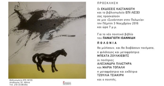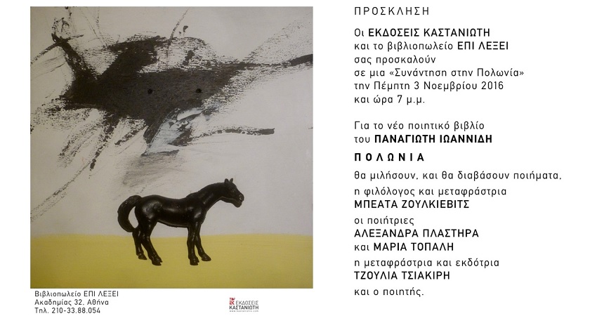 Trzeci tomik poetycki Panagiotisa Joannidisa zatytułowany „Polska” (Wydawnictwo Kastaniotis) zostanie zaprezentowany w księgarni „Epi Lexi”, 3 listopada (czwartek) o godzinie 19.00, ul. Akadimias 32, Ateny.