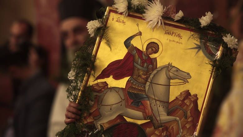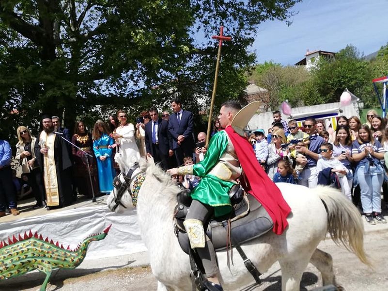 * Na przedmieściach Sérres, miasta w środkowej Macedonii, w Grecji mieszkańcy świętują Drakoktonia, która ma miejsce w Dzień Świętego Jerzego. Specjalną ceremonię otwierają dwie kobiety, ubrane na czarno, prowadzące księżniczkę na miejsce poświęcenia przed świątynią, gdzie czeka na nią Smok. Święty Jerzy pojawia się na białym koniu i zabija smoka włócznią. Następnie, aby uczcić uratowanie księżniczki, zaczyna się świętowanie pijąc wino, podczas oglądania turnieju tradycyjnego wrestlingu, po południu w tym samym miejscu, w pobliżu kościoła św. Jerzego. Mieszkańcy celebrują to jednak na pamiątkę innego wydarzenia, ale również związanego z wstawiennictwem świętego. Jak głosi legenda, kiedyś, przed buntem przeciwko tureckim rządom, chłopcy ze wsi rywalizowali z Turkami w tradycyjnym zapasach i wygrywali. Uważano to za znak przyszłego zwycięstwa i wyzwolenia narodu greckiego z jarzma obcego. Po buncie Greków turniej ten stał się sławny i obecnie gromadzą się w nim zapaśnicy z całej Grecji.